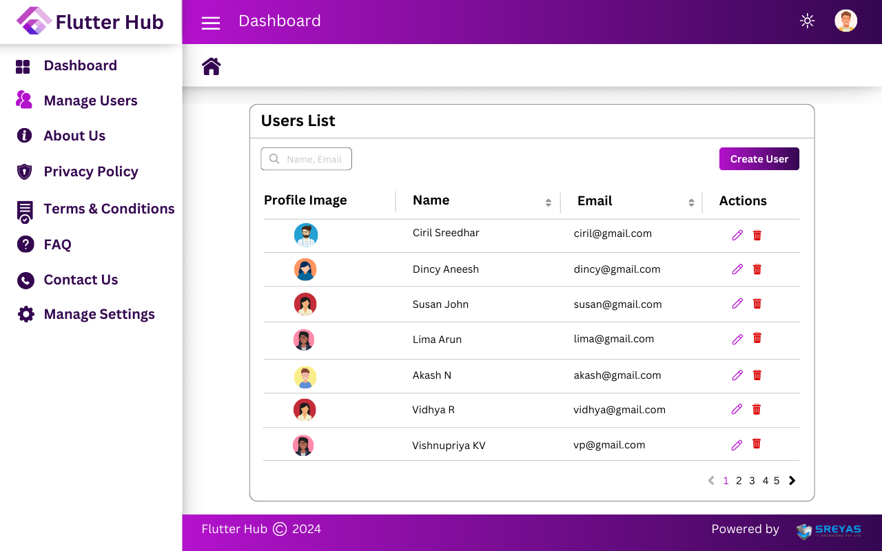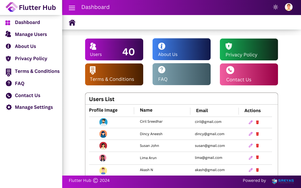 The Flutter Hub admin dashboard serves as a powerful command center, empowering administrators with robust tools for efficient user management and backend customization. From overseeing user authentication and registration to managing privacy policies and terms & conditions, the dashboard offers comprehensive control. It seamlessly integrates in-app updates and streamlines profile management, enhancing the overall user experience.